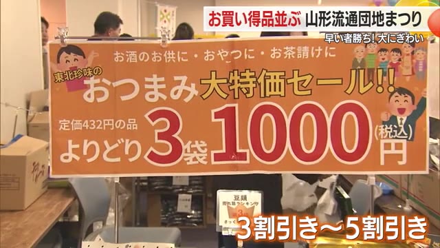 山形市の卸売会社が集まる流通団地で、食料品などをお得に販売するイベントが開かれた。訪れた人たちはお目当てのものを次々と買い求めていて、朝から大にぎわいだった。